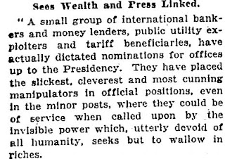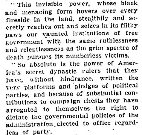 "Les puissances du capitalisme financier avaient un plan de grande envergure, rien de moins que de créer un système mondial de contrôle financier dans les mains du secteur privé capable de dominer le système politique de chaque pays et l'économie mondiale d'un seul tenant."