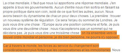 "On ira ensemble vers ce nouvel ordre mondial. Et personne, je dis bien personne ne pourra s'y opposer, car à travers le monde, les forces au service du changement sont considérablement plus fortes que les conservatismes et les immobilismes. "