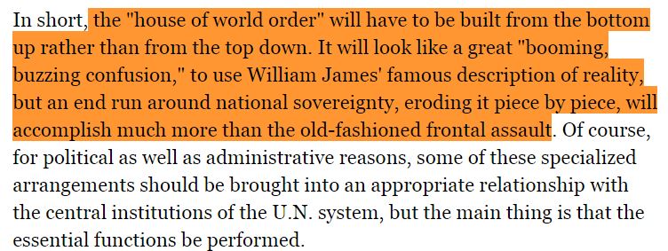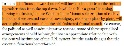 "La "demeure de l'Ordre Mondial" devra être construit en partant du bas plutôt qu'à partir du haut… mais le contournement de la souveraineté nationale, en l'érodant morceau par morceau réussira beaucoup plus que le démodé assaut frontal."