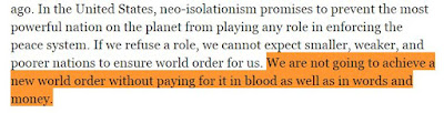 "Nous ne pourrons pas réaliser un nouvel ordre mondial sans en payer le prix en vies humaines aussi bien qu'en mots et en argent."